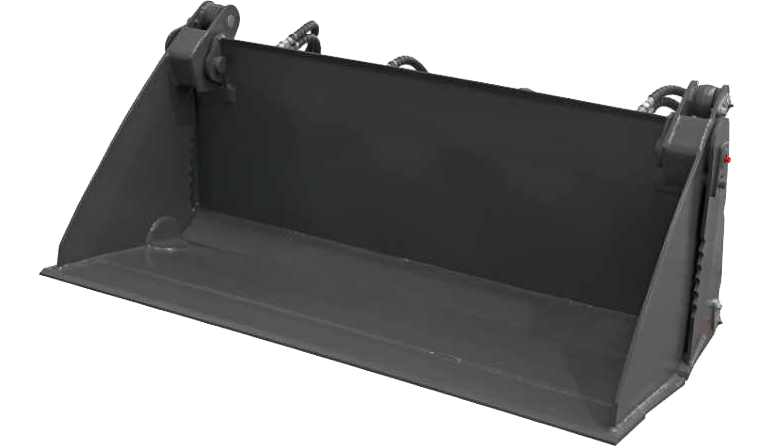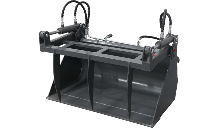 A versatile attachment for loaders that combines four functions: a standard bucket for digging and loading, a dozer blade for pushing and spreading, a grapple for clamping and carrying debris, and a scraper for levelling and back-dragging.
